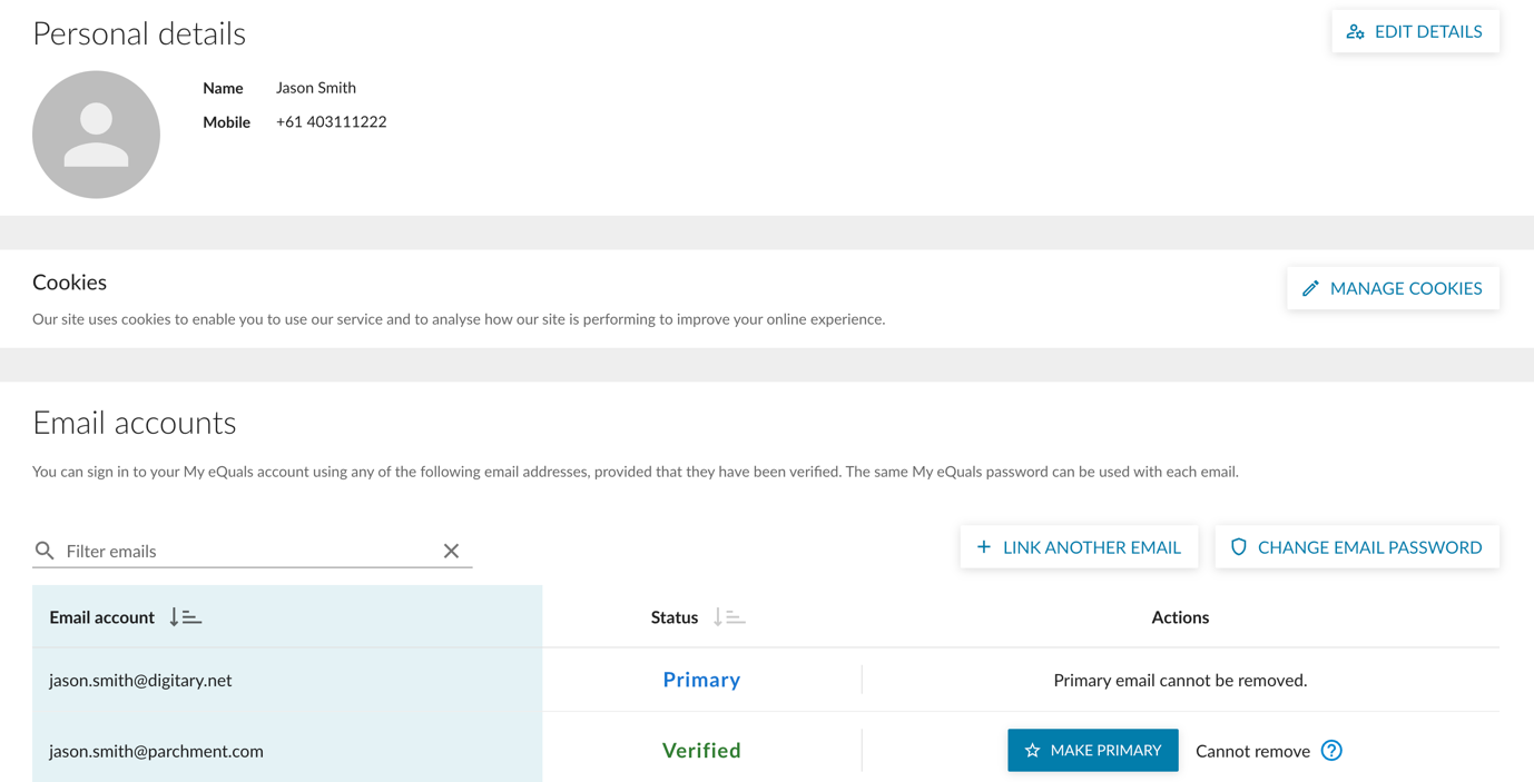 Additionally, if desired, you can designate the newly added personal email as the primary email address by clicking on the "MAKE PRIMARY" button.