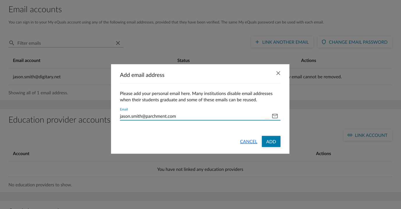 Step 4: A window titled "Add email address" will appear. Enter the personal email address you wish to link and click on the "ADD" button.